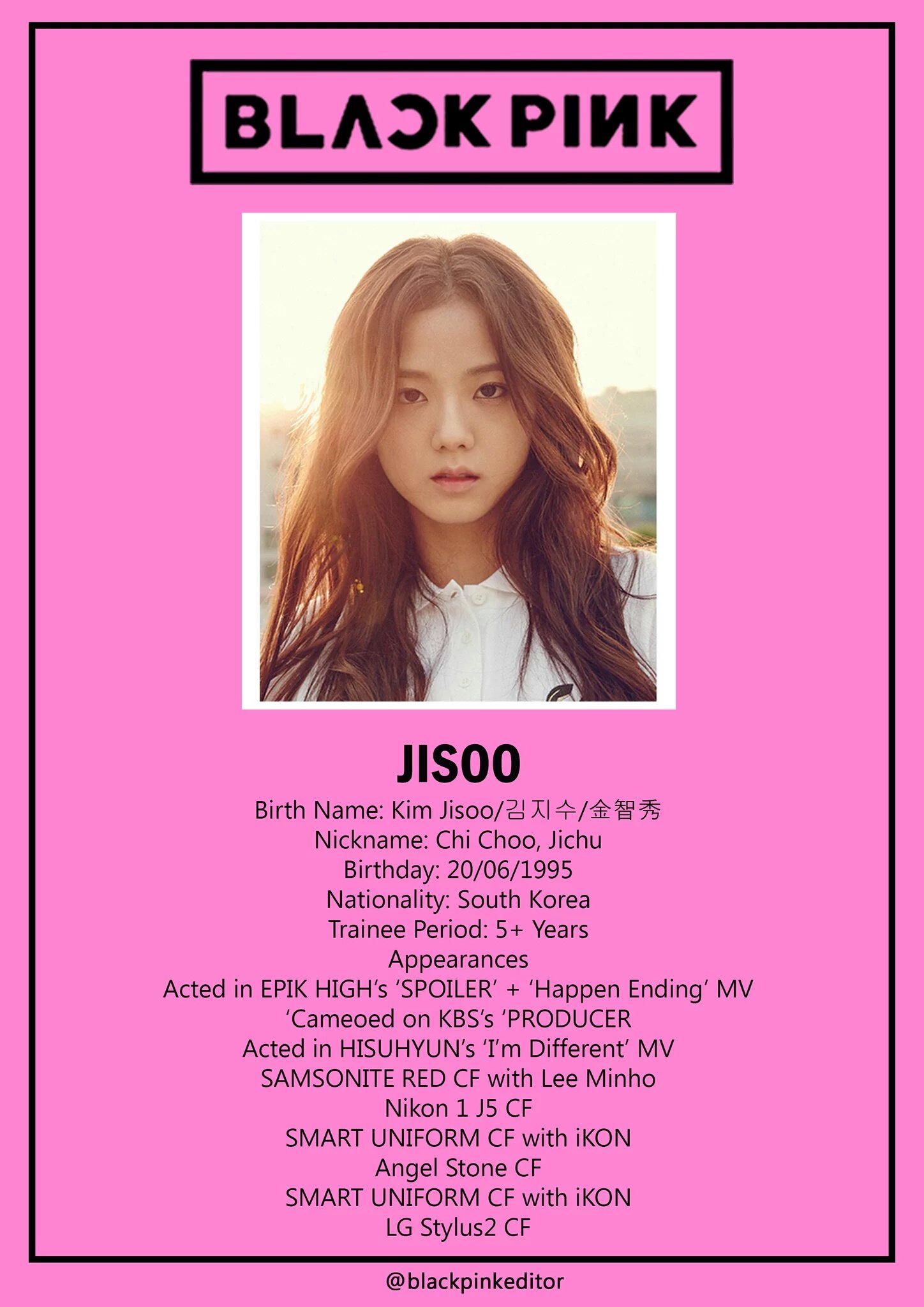 Blackpink group members (names) kim jisoo kim jennie roseanne park lalisa manoban sizes of blackpink members the tallest blackpink member is rosé with a height of 1.68, while the shortest member is kim jisoo with a height The korean name of jisoo is kim ji soo / 김 지수. The group consists of four girls, namely lisa, rosé, jennie, and jisoo.